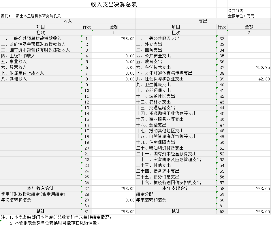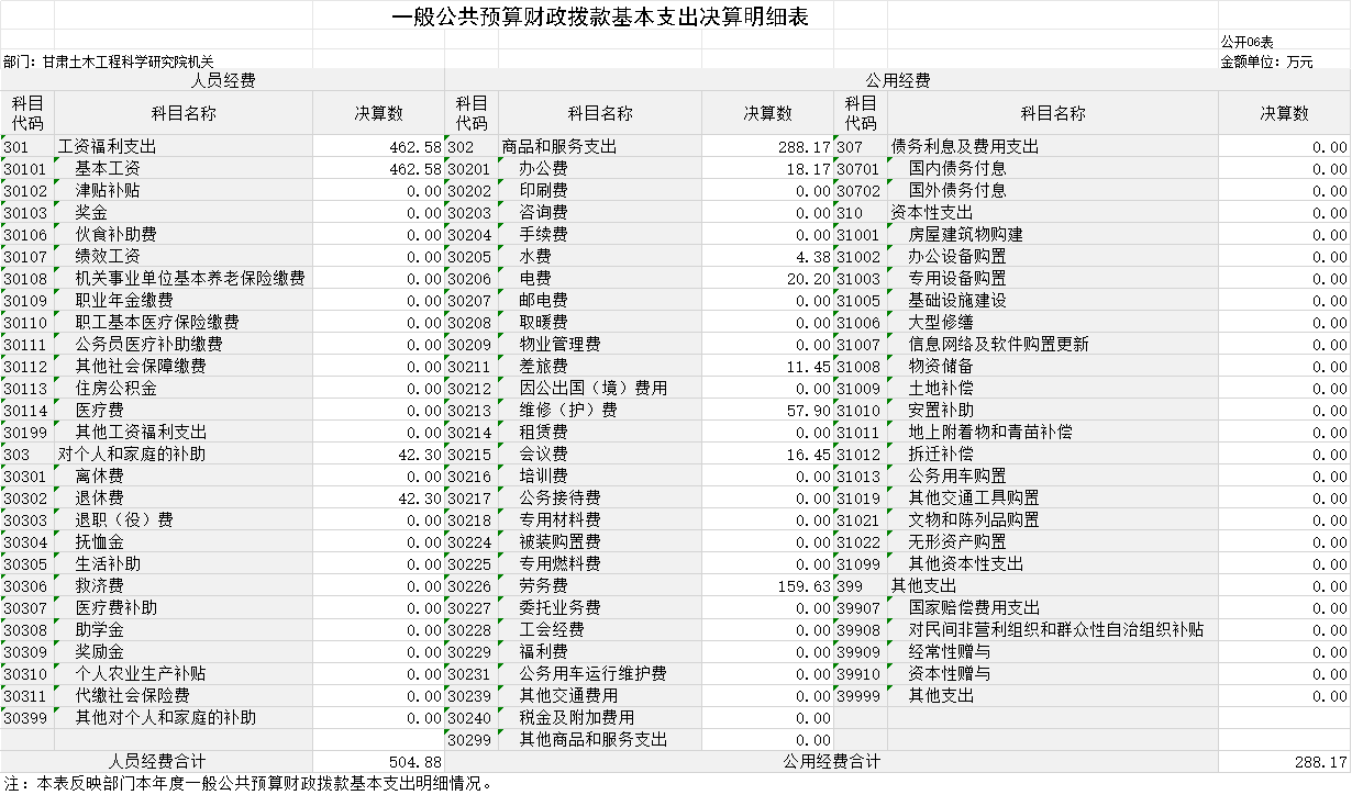 2023年度財政撥款收、支總計均為793.05萬元。與上年相比,各增加0.94萬元,增長0.12%。主要原因是社會保障和就業(yè)收、支較上年增加0.94萬元。其中:科研機構人員經費504.88萬元,占比63.66%;公用經費288.17萬元,占比36.34%。